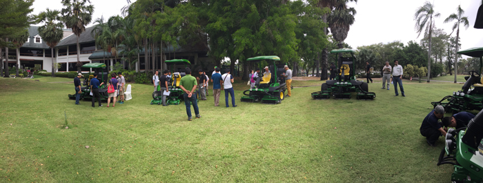 三天的培訓(xùn),時(shí)間安排緊湊有序,每天早晨七點(diǎn)準(zhǔn)時(shí)乘車出發(fā)去培訓(xùn)地點(diǎn)。前兩天培訓(xùn)安排在Lakewood高爾夫球場(chǎng),最后一天的服務(wù)培訓(xùn)則安排在迪爾培訓(xùn)中心。首先從A系列最先進(jìn)技術(shù)Tech-control系統(tǒng)開始模擬操作學(xué)習(xí),通過顯示屏操控、設(shè)定、了解整車的運(yùn)行、剪草、維修、診斷等功能。Tech-control可視界面,具備指尖控制功能,不僅有助于實(shí)現(xiàn)出色的剪草效果,還可提高機(jī)器的工作效率。然后我們分組圍繞機(jī)器,進(jìn)行最直觀的實(shí)機(jī)學(xué)習(xí)和討論,在輔導(dǎo)老師的提示下,識(shí)別并列出每款A(yù)系列機(jī)器的新增功能、改進(jìn)及變化之處。之后老師通過一張張機(jī)器部位卡片和實(shí)際部件,清晰明了地講解每個(gè)機(jī)型的每個(gè)改進(jìn)部位,不僅讓銷售人員們對(duì)機(jī)器的部件有更加清楚地認(rèn)知,而且對(duì)部件的位置、形狀和區(qū)別,都有了深刻的印象,值得我們學(xué)習(xí)借鑒。最后根據(jù)這兩天的學(xué)習(xí),每個(gè)人都親自上車實(shí)機(jī)演示,上車前設(shè)置好剪草、運(yùn)輸、轉(zhuǎn)彎速度,手指輕按Tech-control操作平臺(tái)按鈕,即可感受自動(dòng)巡航功能帶來的前所未有的操作員感受。通過課堂理論的學(xué)習(xí),以及室外場(chǎng)地的實(shí)機(jī)操作,使我們對(duì)A系列的新產(chǎn)品了解的更加透徹。在總結(jié)會(huì)上,老師準(zhǔn)備了很多A系列新功能的小標(biāo)題,通過游戲傳球的方式,讓大家利用小標(biāo)題展開話題進(jìn)行講解,課堂氣氛生動(dòng)活潑,學(xué)員參與話題積極踴躍,而李國強(qiáng)對(duì)7200A在球場(chǎng)意外停機(jī)處理辦法的細(xì)致全面的講解,贏得了學(xué)員們熱烈的掌聲。