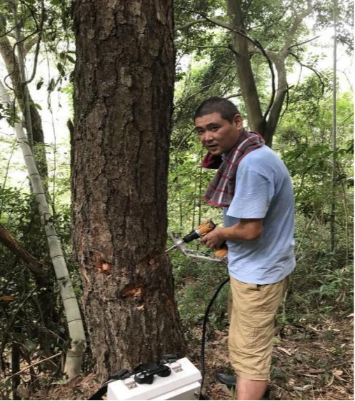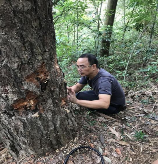 2022年9月8號(hào),汪洋帶上綠友電動(dòng)樹干打孔注藥機(jī)、木塞、藥品以及相應(yīng)工具。早上五點(diǎn)鐘從廣州出發(fā),舟車勞頓數(shù)百公里,踏上拯救坪坑參天古樹的旅程。趕到潮州坪坑村,村委部文主任領(lǐng)路去村后的山上查看古松樹。在看過所有的古樹以后,根據(jù)松樹的枯葉癥狀,樹木呈現(xiàn)出來的病癥,最后診斷確認(rèn)是松材線蟲危害所致。汪洋將診斷結(jié)果以及解決方案告知文主任,并通過電話向省林業(yè)部領(lǐng)導(dǎo)作匯報(bào),得到批復(fù)后立即展開作業(yè)。