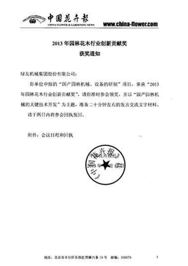 綠友榮獲“2013年園林花木行業創新貢獻獎”獲獎通知: