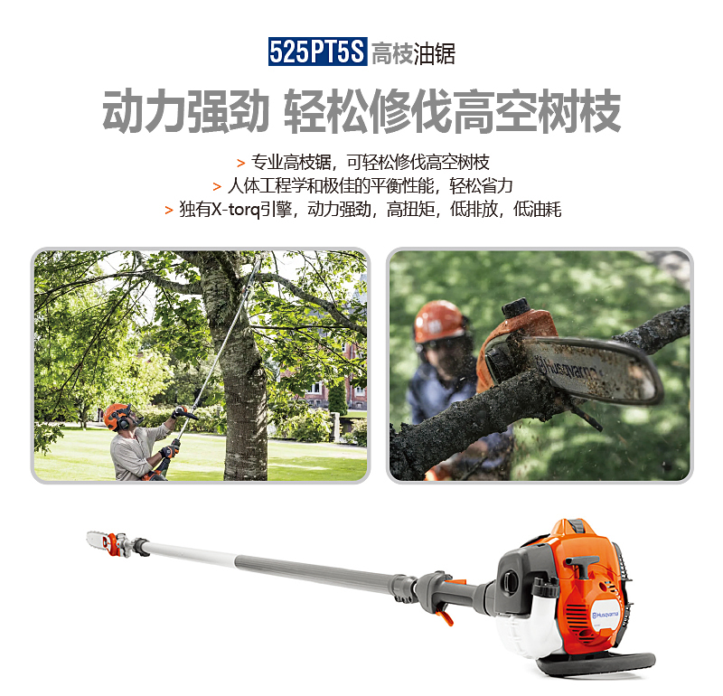 為專業用戶而設計,富世華525PT5S配備延長桿,可以清除高空樹枝,人體工程學和平衡性助您以輕松的方式完成任務。操作簡便,X-Torq?引擎保證強勁動力,高扭矩,低排放和低油耗。