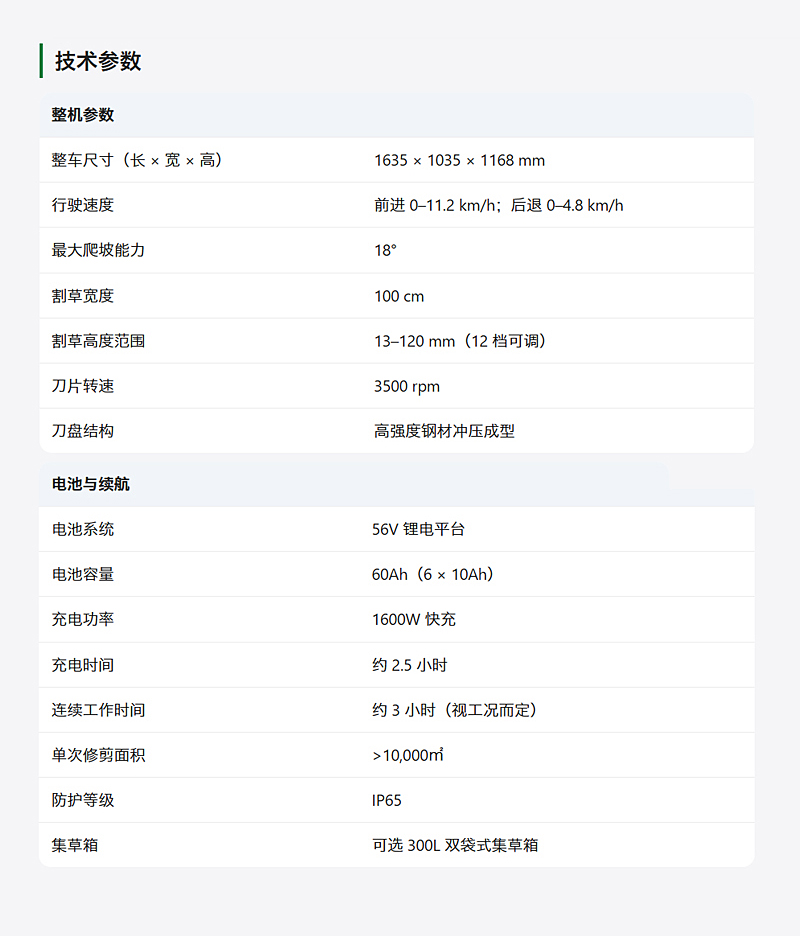 - ● 長效續航能力:60Ah 大容量電池平臺,2.5 小時快充,單次修剪面積可超過 10,000㎡。