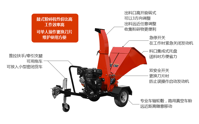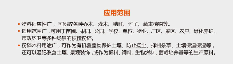 適用范圍廣,可用于苗圃、果園、公園、學校、單位、物業、廠區、景區、農戶、綠化養護、市政環衛等多種場景枝椏粉碎,最大粉碎直徑10cm。
